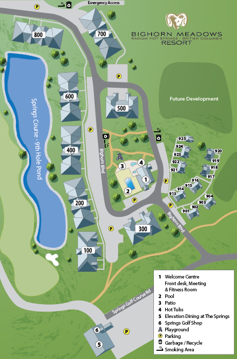 With 9 acres of mountain accommodations surrounded by the Springs Golf course, Bighorn Meadows Resort offers a wide range of condo-style & duplex-style suites (with more being developed in the future). This resort map illustrates where the accommodation buildings, amenities, golf course, and Welcome Centre are located.